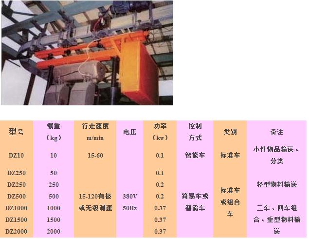 電動(dòng)自行小車(chē)輸送系統(tǒng)是在水平、垂直方向都能自由行走的單軌系統(tǒng)。由軌道、道岔、升降裝置、電控系統(tǒng)五大部分組成。廣泛地應(yīng)用于機(jī)械、化工、汽車(chē)生產(chǎn)流水線(xiàn)、檢測(cè)線(xiàn)和郵電、醫(yī)院、海關(guān)等部門(mén)小件物品輸送。